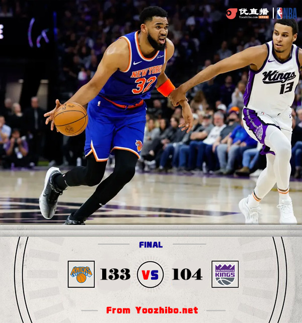 178直播讯北京时间3月11日讯 NBA常规赛,国王背靠背主场迎战尼克斯。国王昨天刚被小卡压哨绝杀,目前33胜30负西部第9位,而尼克斯也是3连败,40胜23负东部第3位。本场比赛,蒙克复出。比赛开始,双方上来各自通过暴扣开局,你来我往比分很胶着,麦克布莱德状态火热内外线弹无虚发单节轰下15分,尼克斯顺势领先到15分,次节尼克斯继续发力拉开20分以上领先,国王10-0迅速止血回应,但唐斯和阿努诺比连续反击再次拉开比分,半场尼克斯领先15分。下半场,国王继续追分,尼克斯外线接连3记三分强势稳住局势,随后尼克斯外线继续发炮领先到近30分,末节双方继续拉锯战,尼克斯发力拉开30分以上领先,双方逐渐换上替补练兵,最终尼克斯133-104轻取国王,终止3连败。