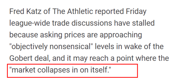 即便如此,他依然得到了10换1的待遇,那么像杜兰特这样的MVP级别球员又该价值几何?The Athletic的名记Fred Katz报道称戈贝尔交易之后,一些球队的要价在客观上接近“荒谬”的地步,有可能导致“市场自行崩溃”。