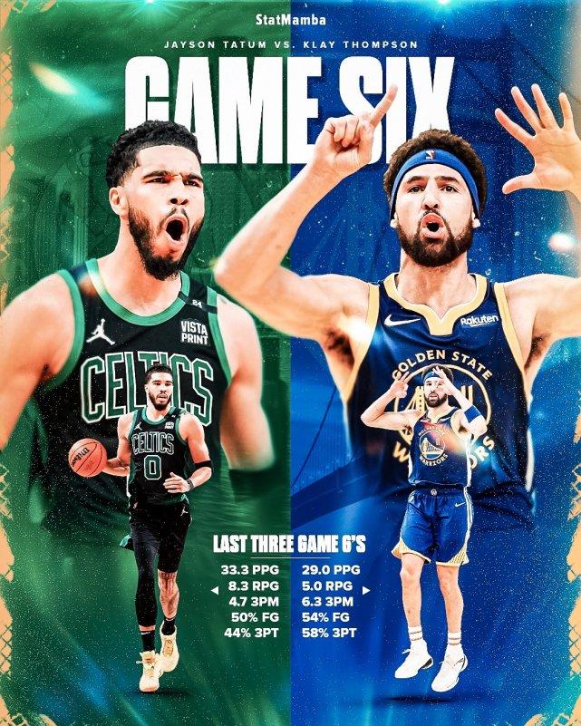 数据显示,过去3场G6比赛,汤普森场均29分5篮板,投篮命中率54%,三分命中率58%,场均命中6.3个三分球,同样是过去3场G6比赛,塔图姆场均33.3分8.3篮板,投篮命中率50%,三分命中率44%,场均命中4.7个三分球。