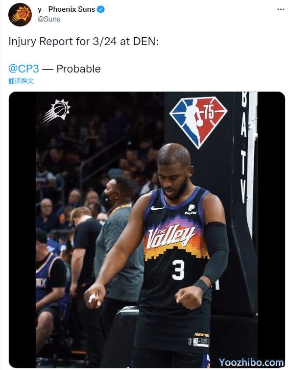 太阳官方正式更新伤情报告,保罗被列为大概率出战,但名记Chris Haynes确认保罗今日复出,发推报道:太阳队球星克里斯-保罗在因左拇指骨折连续缺席 15 场比赛后,今晚确实将复出对阵丹佛掘金。