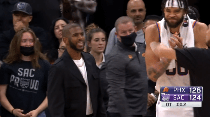 末节关键时刻,艾顿六犯毕业,布克投进关键两分,国王米切尔上篮追平比赛,布克错失三分绝杀,两队打进加时赛;加时赛麦基和布克先后六犯毕业,生死时刻沙梅特投进制胜三分,最终太阳客场逆转赢球,赛后保罗、布克等人都拥抱沙梅特庆祝。