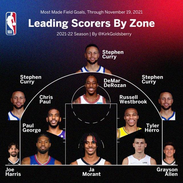 新赛季各区域得分王出炉!库里统治三分线 莫兰特称霸禁区威少上榜