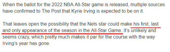 Brian Lewis表示,欧文仍然在篮网队的官方名单上,他有资格获得全明星选票,即使本赛季没有为篮网出战,他也能获得全明星选票。