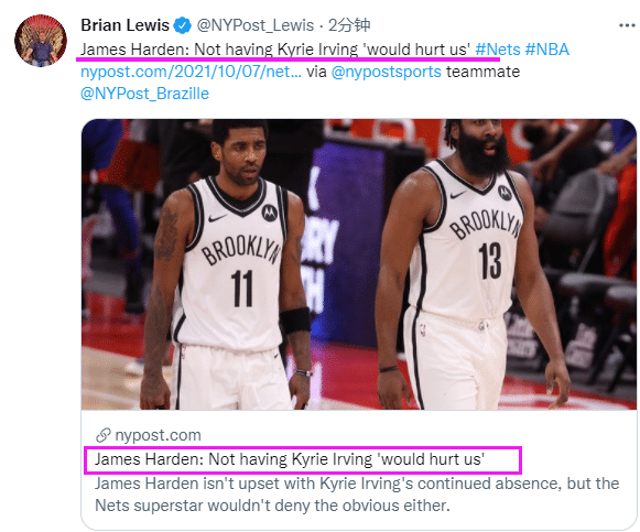 对于篮网队内的情况,名嘴“美国杨毅”A-史密斯在节目中表示:拥有欧文的篮网肯定会很特别,这点毫无疑问,但没有欧文篮网也会很特别,如果KD说‘受够了’,欧文就将走人,被交易,当然前提是篮网能找到球队接手他。