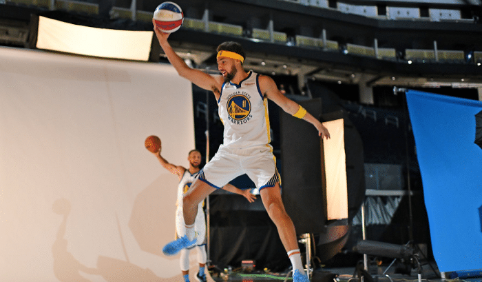 如今克莱回归和克莱拍摄定妆照,其中水花兄弟终于合体,他们一起拍摄的照片被认为是最佳瞬间。库里和克莱同时出现在镜头面前,库里做出扣篮动作,克莱则是上篮的动作,两人同框。