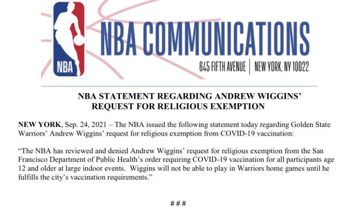来源:178直播09-25 09:50178直播9月25日讯NBA官方已经拒绝了维金斯以宗教为由拒绝接种疫苗的请求,旧金山当地规定12岁及以上的人必须接种疫苗才能进入大通中心球馆,NBA官方还在声明中提到:除非维金斯接种疫苗,否则他无法参加勇士主场的比赛。
