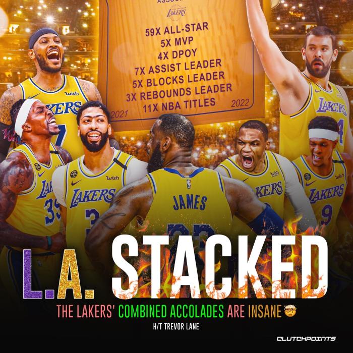 今年休赛期,湖人打造一支群星汇聚的豪华阵容,拥有7名全明星球员——詹姆斯、威少、浓眉、甜瓜、霍华德、朗多和小加索尔,他们7人总共59次全明星、11次夺得总冠军、还有7次助攻王、5次盖帽王和3次篮板王;湖人如此豪阵将冲击队史第18座总冠军。