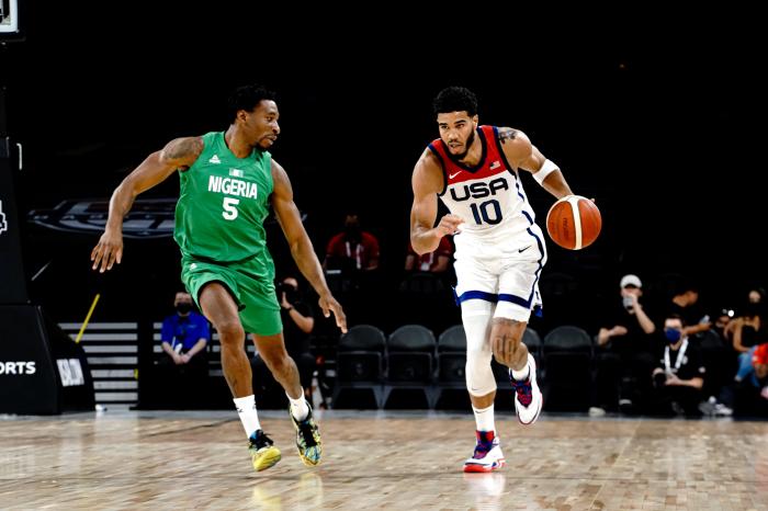 整个上半场,美国男篮仅仅领先尼日利亚2分,这热身赛打得十分艰难,杜兰特状态十分糟糕,频频打铁不中,第二节突破之后试图扣篮,却惨遭热火小将阿丘瓦大帽,直接被帽翻倒地;上半场塔图姆贡献11分,利拉德8分和阿德巴约、格林各有6分,很难想象杜兰特得分居然不如格林。