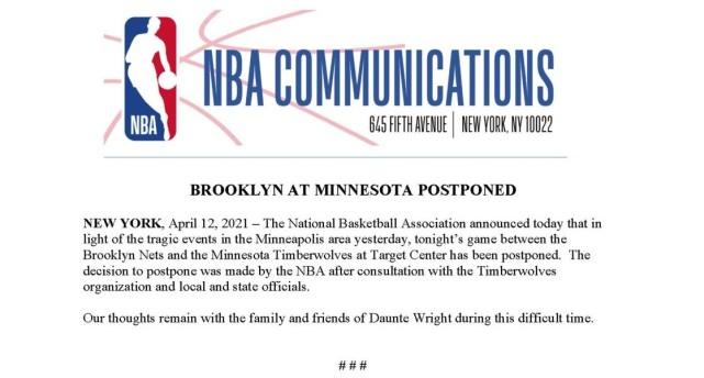 来源:178直播04-13 11:42178直播讯北京时间4月13日,NBA官方宣布,鉴于昨天在明尼阿波利斯地区发生的悲惨事件,今晚(当地时间)布鲁克林篮网队和明尼苏达森林狼队在标靶中心的比赛将推迟进行。比赛延期的决定,是NBA在征询森林狼队以及当地官员后做出的,在公告中,联盟还对当特-赖特的家人和朋友致以哀思。