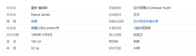里斯·詹姆斯(Reece James),1999年12月8日出生于英国伦敦,英格兰足球运动员,司职后卫,现效力于切尔西足球俱乐部。个人简介