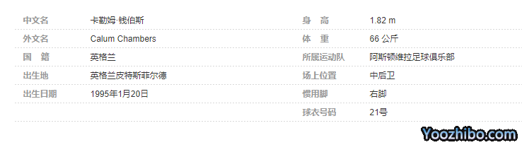 卡勒姆·钱伯斯(Calum Chambers)(Calum的英语发音译名是卡勒姆),1995年1月20日出生于英格兰皮特斯菲尔德,英格兰足球运动员,司职中后卫,效力于英格兰足球超级联赛的阿斯顿维拉俱乐部。个人简介