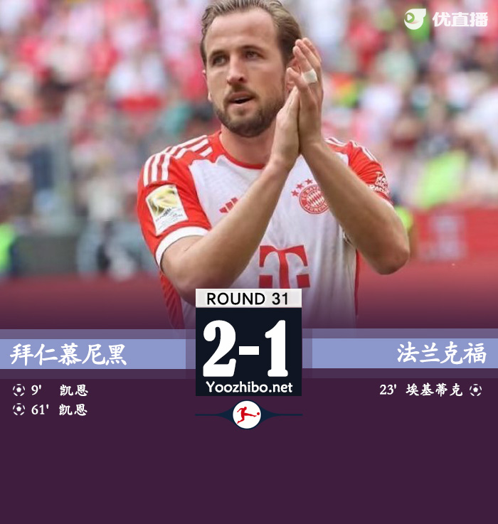 178直播讯:北京时间4月27日21:30,德甲第31轮,拜仁主场迎战法兰克福。上半场,莱默尔一条龙送出助攻后伤退,凯恩破门,埃基蒂克远射扳平;下半场,穆勒造点,凯恩点射梅开二度。最终,拜仁2-1击败法兰克福,积69分继续位列积分榜第二位,球队下周中将迎来与皇马的欧冠半决赛首回合赛事,法兰克福积45分排在积分榜第6位。由于多特本轮输球,拜仁领先多特已达12分,锁定下赛季欧冠资格。