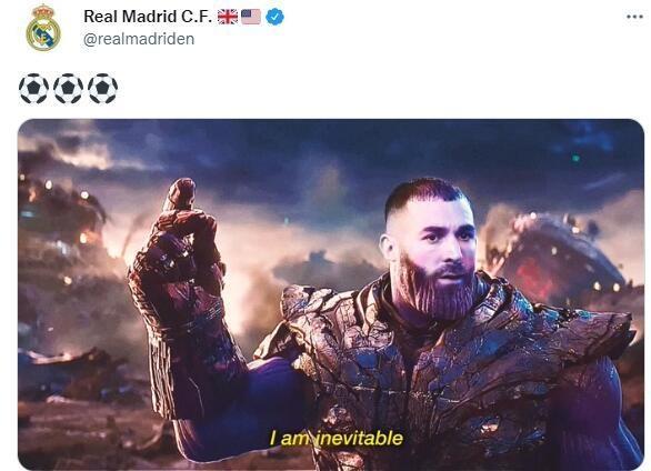 赛后皇马官推将本泽马的头P在《复仇者联盟4》中灭霸的身体上,展示本泽马戴着无限手套打响指的一瞬间,并表示:“我就是天命。”