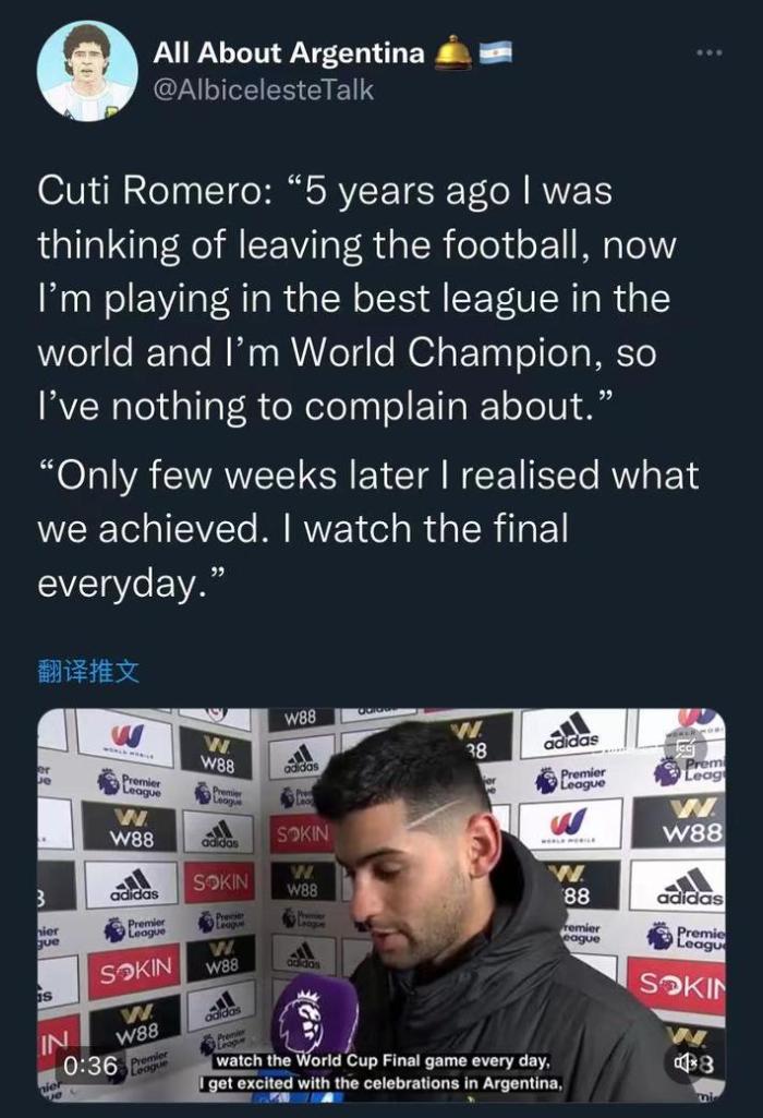 罗梅罗说:“5年前我一度想要离开足球,现在我在世界上最好的联赛踢球,我是世界冠军,所以我没什么好抱怨的。”