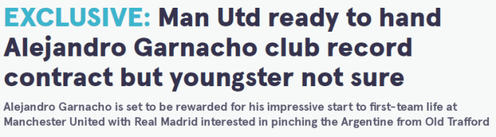 在加纳乔展现出自己的天赋后,他已经吸引了皇马等队的关注,目前他与曼联的合同只剩1年半,因此红魔希望与他续下一份长约。