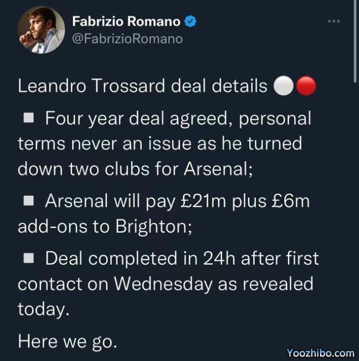 罗马诺表示,特罗萨德将与阿森纳签约4年,不过个人条款从来不是问题,球员为加盟阿森纳已经拒绝了其他两家俱乐部。