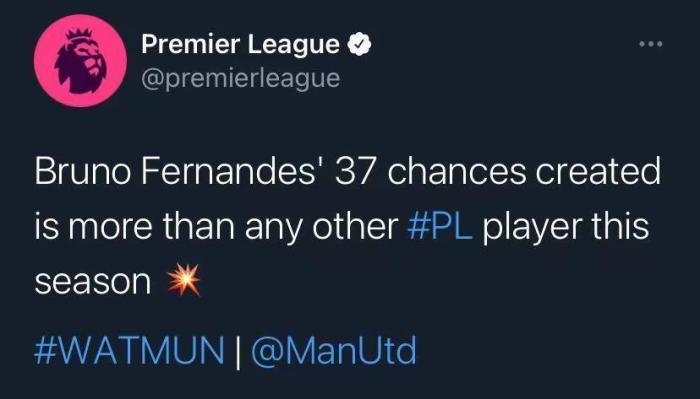 178直播11月20日讯 ,曼联将在本轮英超客场挑战沃特福德。赛前,据英超官方统计,B费本赛季创造机会数为英超球员第一。