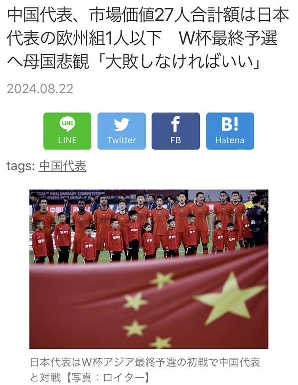 来源:178直播08-22 12:38178直播讯 中国男足征战18强赛前2轮的国脚名单已经公布,而作为国足18强赛的第1个对手,日本媒体自然也对此相当关注,不过在日媒看来,中国男足似乎毫无威胁。北京时间8月22日,知名日媒就以《中国队27人全队身价甚至不及日本旅欧球员1人》为题,评价了国足18强赛的阵容。